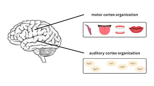 Additionally, some of Dr. Johnson’s early work with Dr. Chang’s group showed that the parts of the brain responsible for producing speech and receiving speech are also organized completely differently. The part of the brain involved in speech production, in the motor cortex, is organized according to the organization of the mouth. Brain regions that control the tip of the tongue are close to parts that control the lips, but far from parts of the brain that control parts of the vocal tract that are deeper in the throat like the uvula. Meanwhile, the auditory cortex is organized by the similarity of sounds. Brain regions that respond to similar sounds are closer together.
